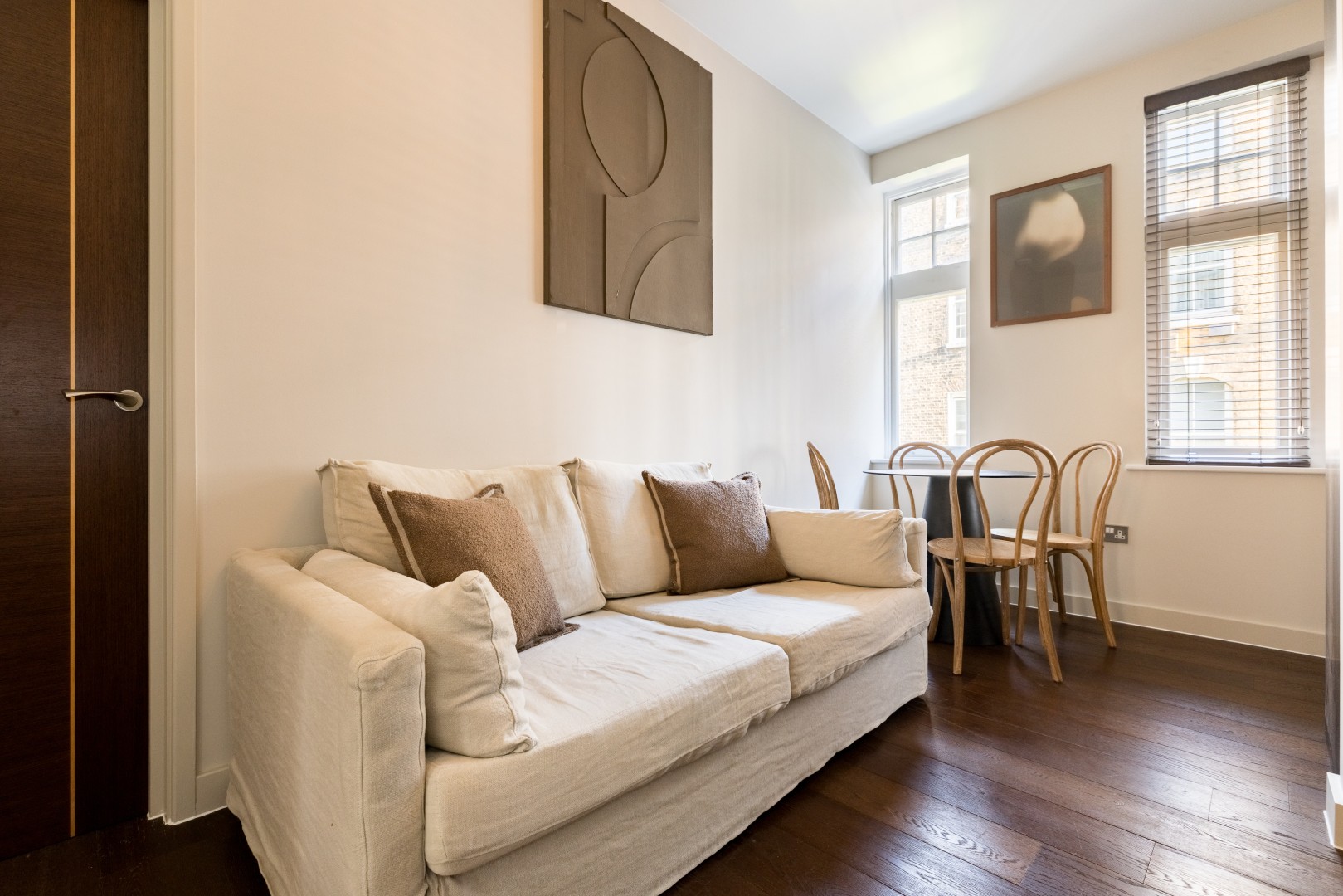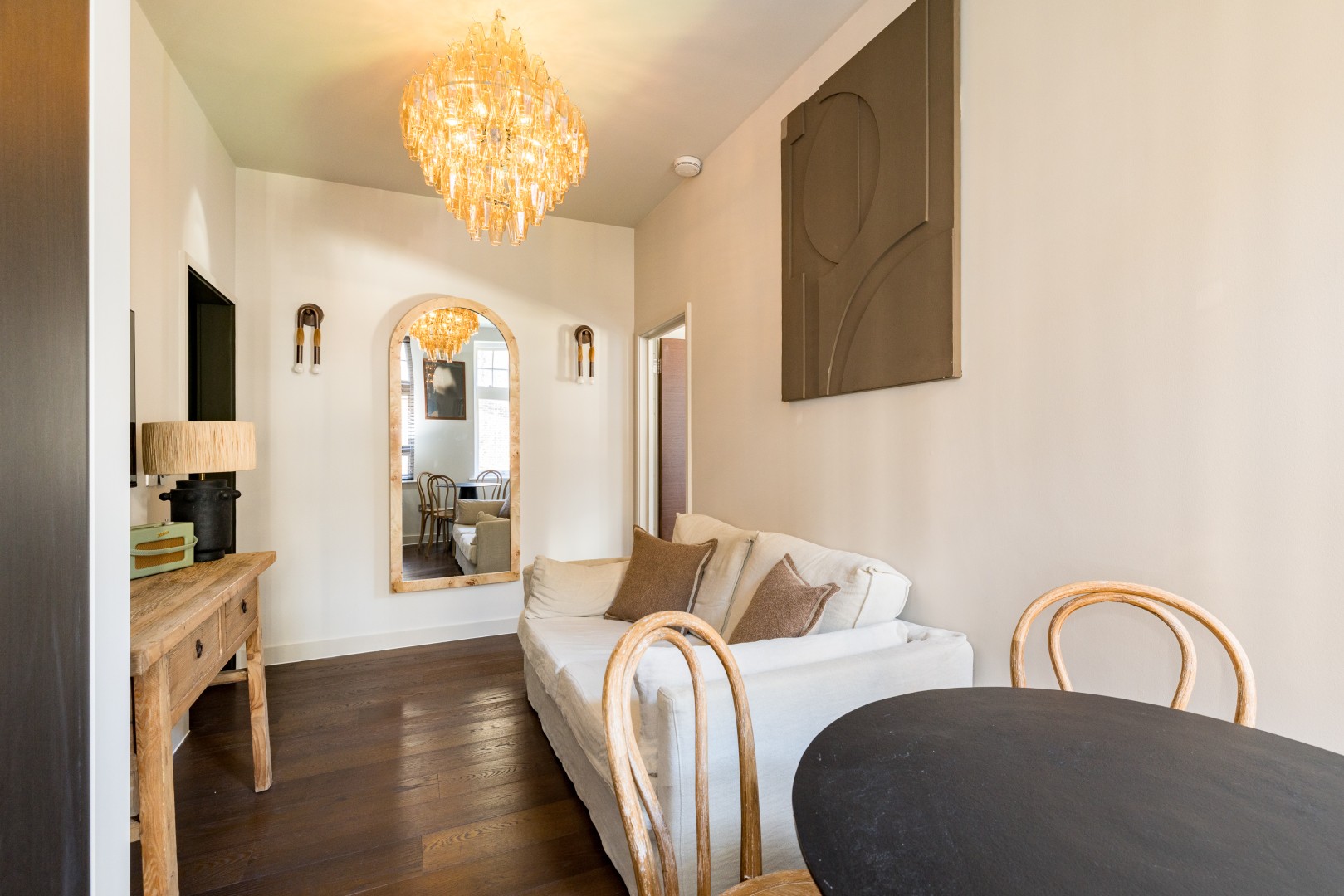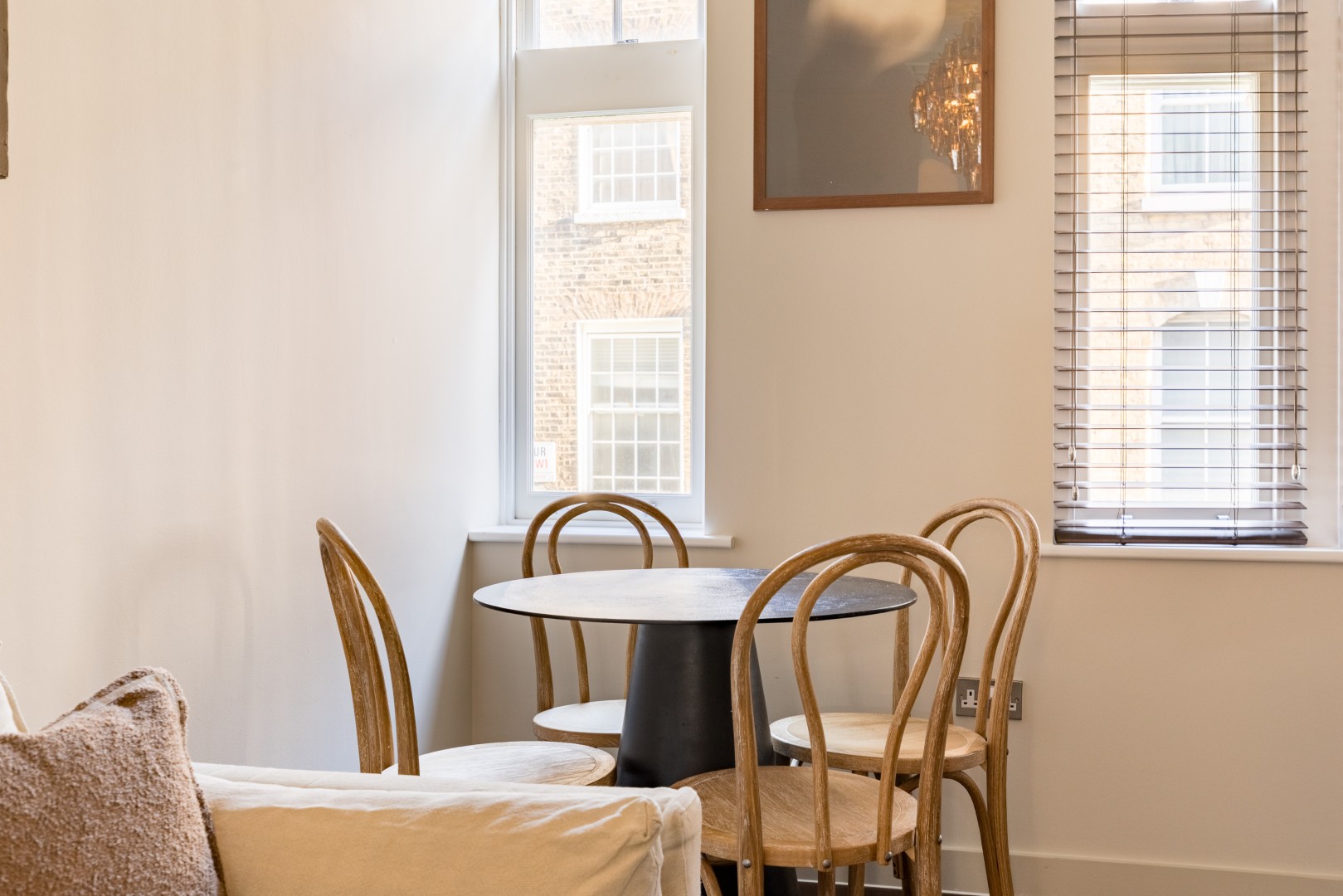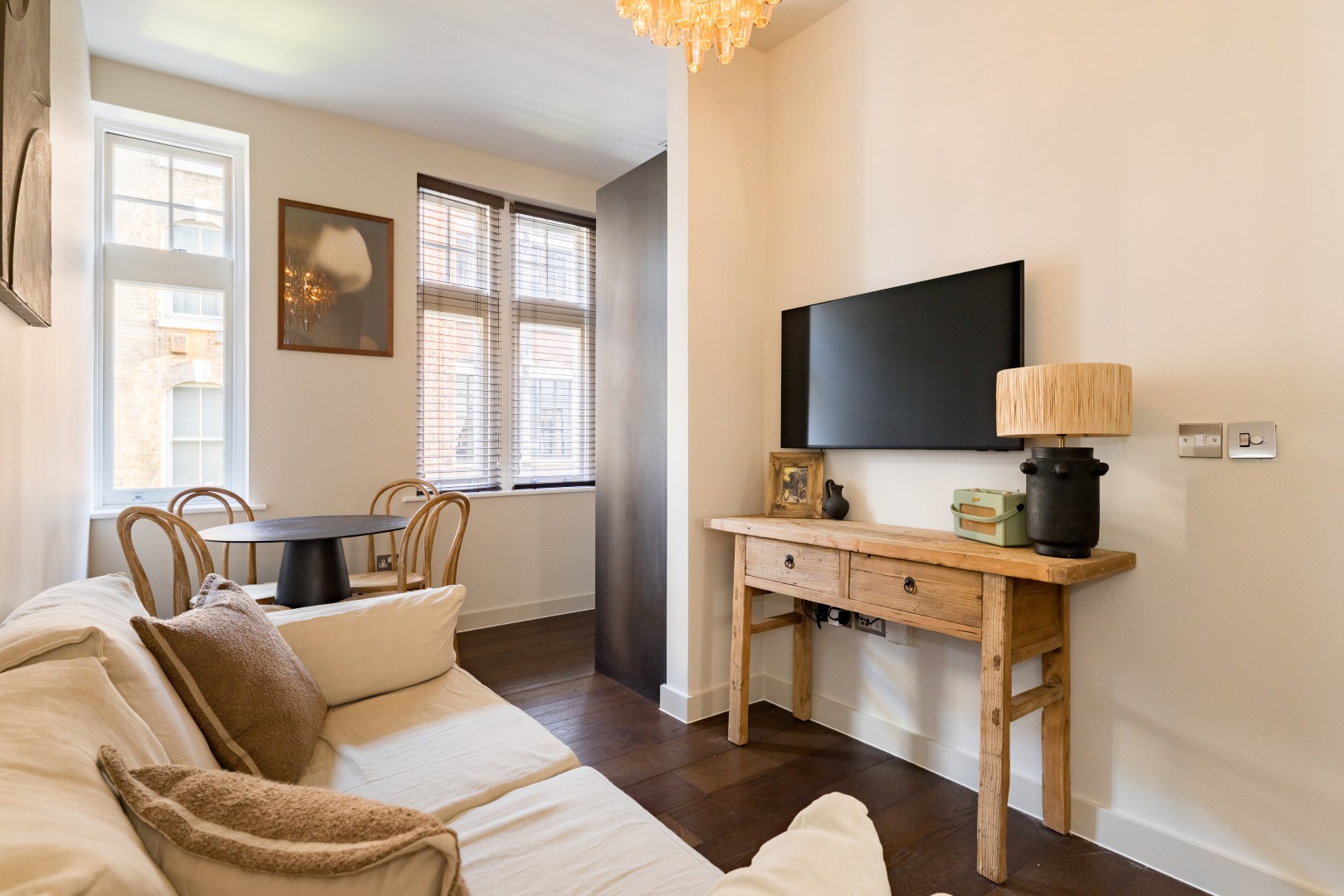 Beautifully designed 2-bedroom apartment on the first floor in the heart of Soho. Calm, stylish interiors with a statement chandelier and curated designer details throughout. TVs with Netflix in both bedrooms and the living room. Air conditioning for warm summer nights. Secondary glazing makes the bedrooms impressively quiet for a restful sleep, despite the central location. Perfect for holidays, short stays or mid-length visits, in the heart of London.