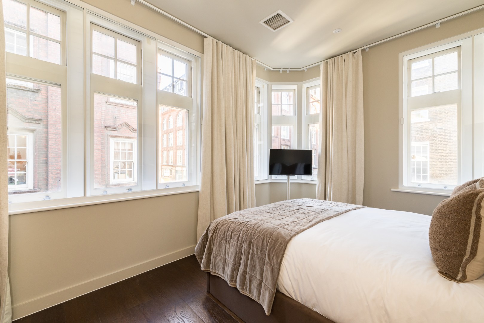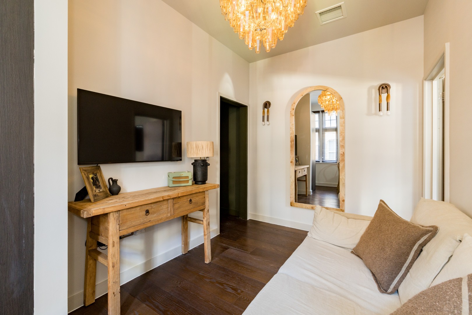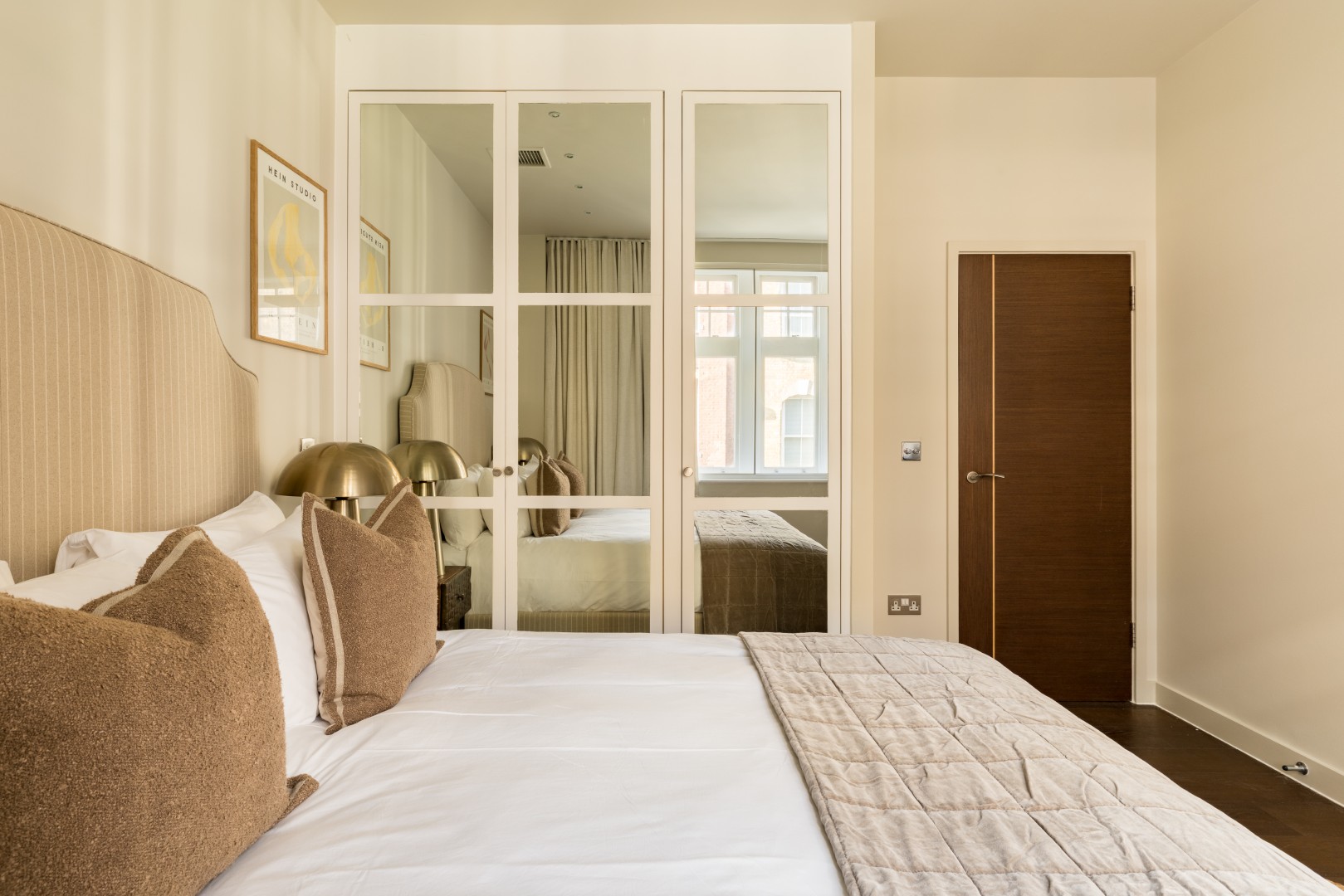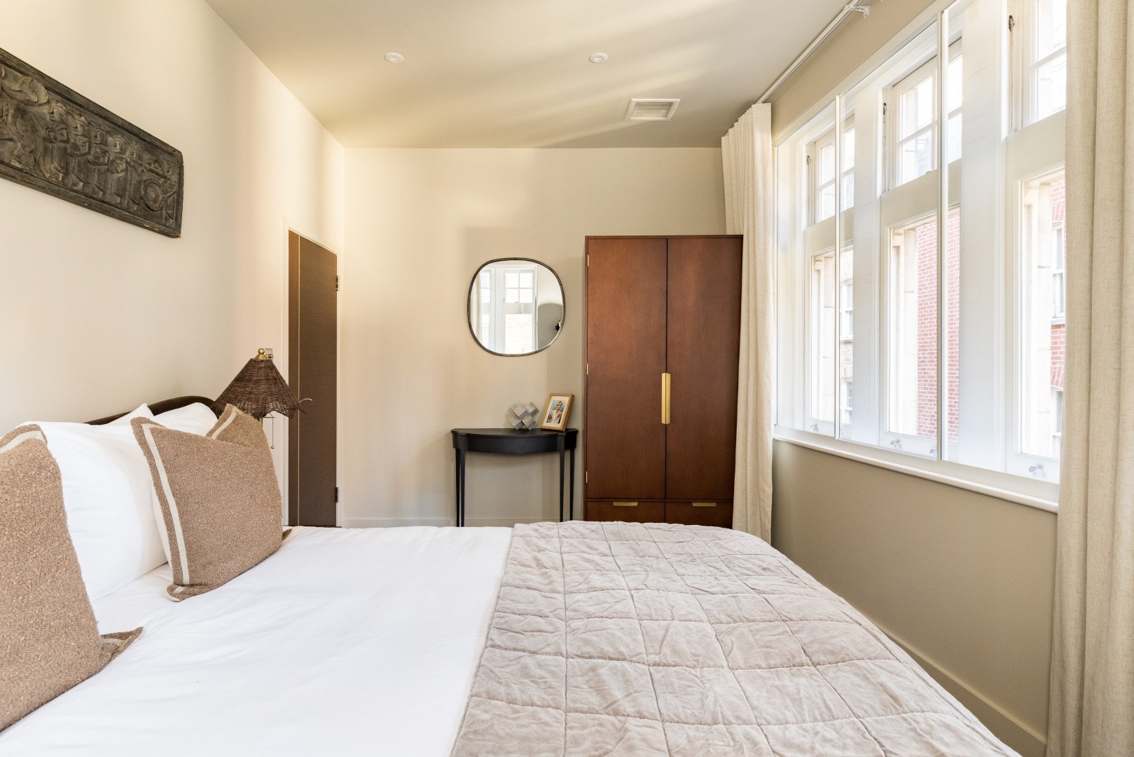 Beautifully designed 2-bedroom apartment on the first floor in the heart of Soho. Calm, stylish interiors with a statement chandelier and curated designer details throughout. TVs with Netflix in both bedrooms and the living room. Air conditioning for warm summer nights. Secondary glazing makes the bedrooms impressively quiet for a restful sleep, despite the central location. Perfect for holidays, short stays or mid-length visits, in the heart of London.