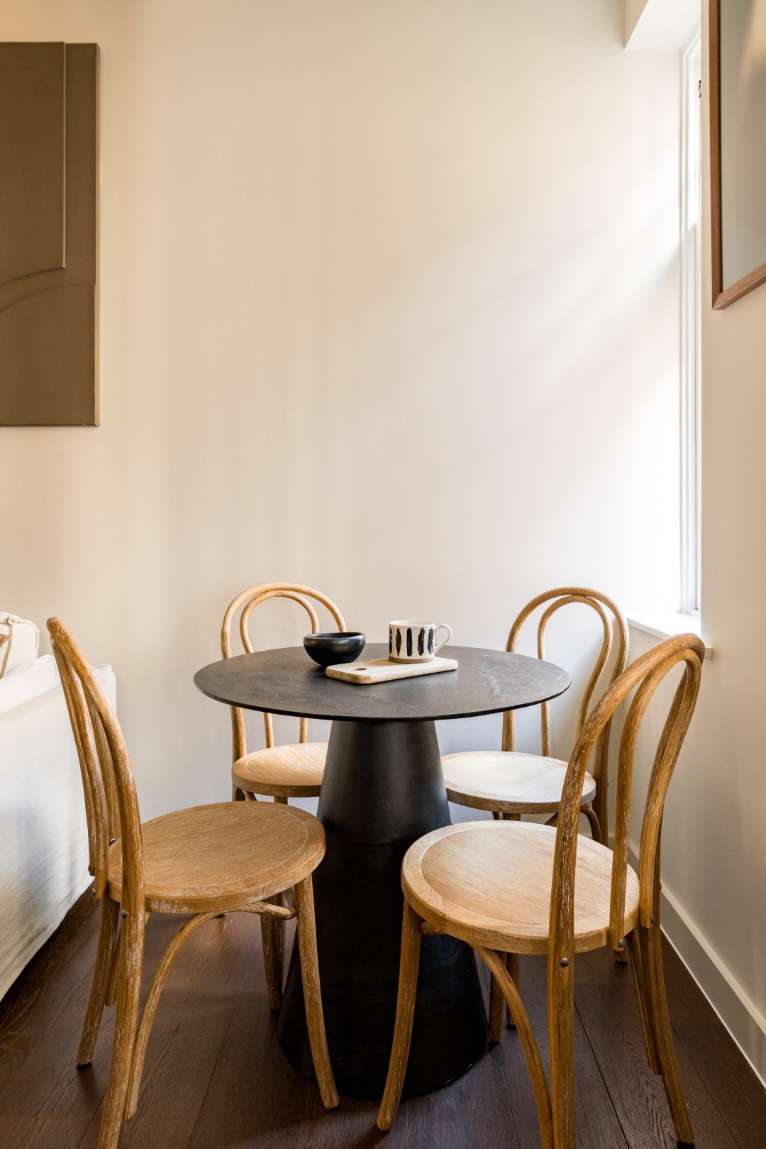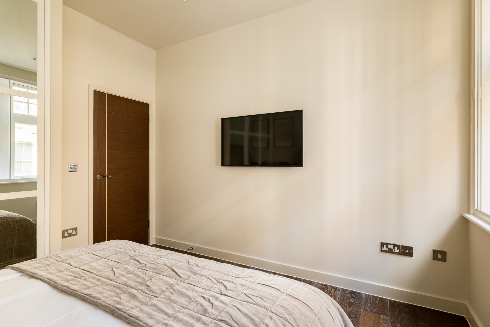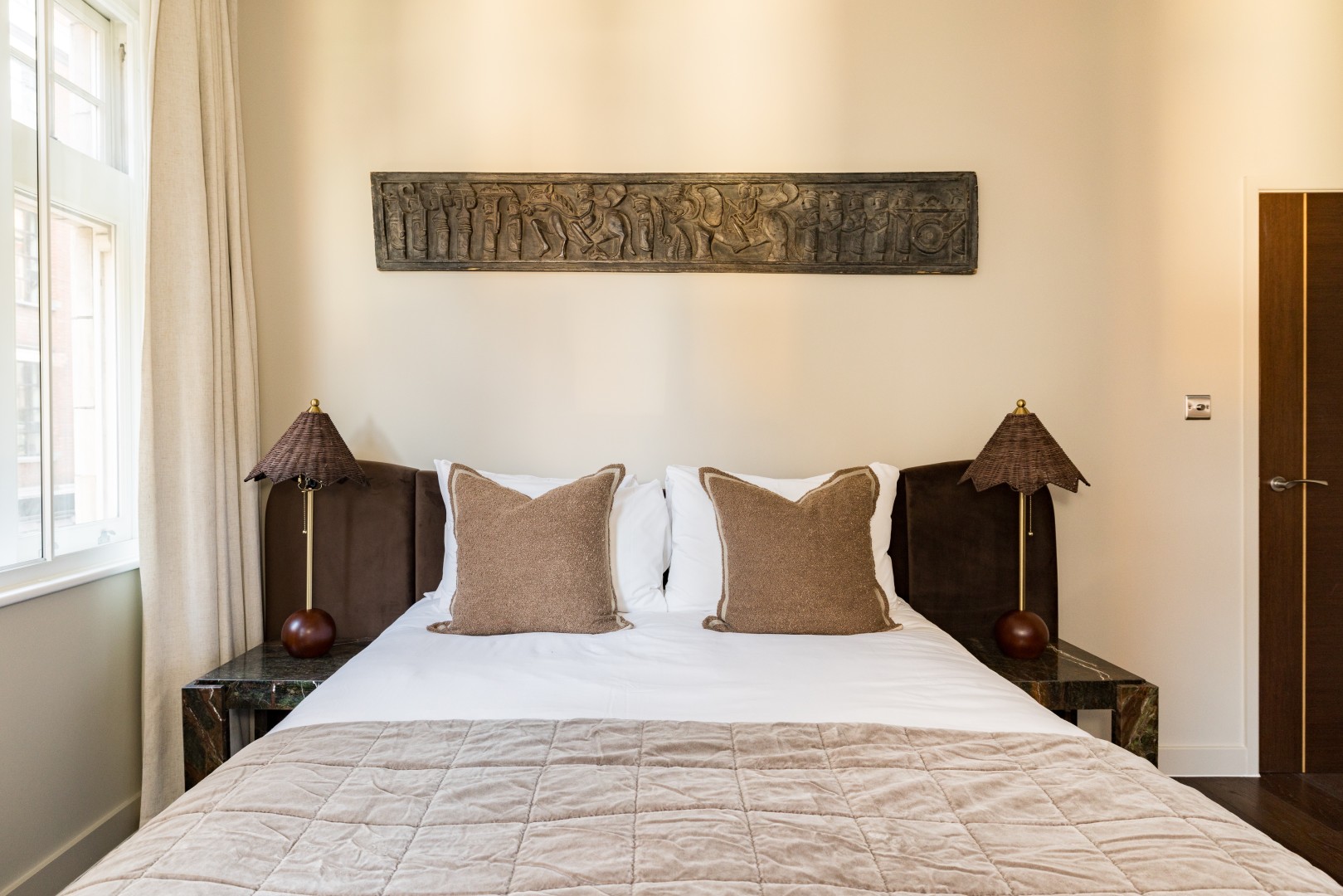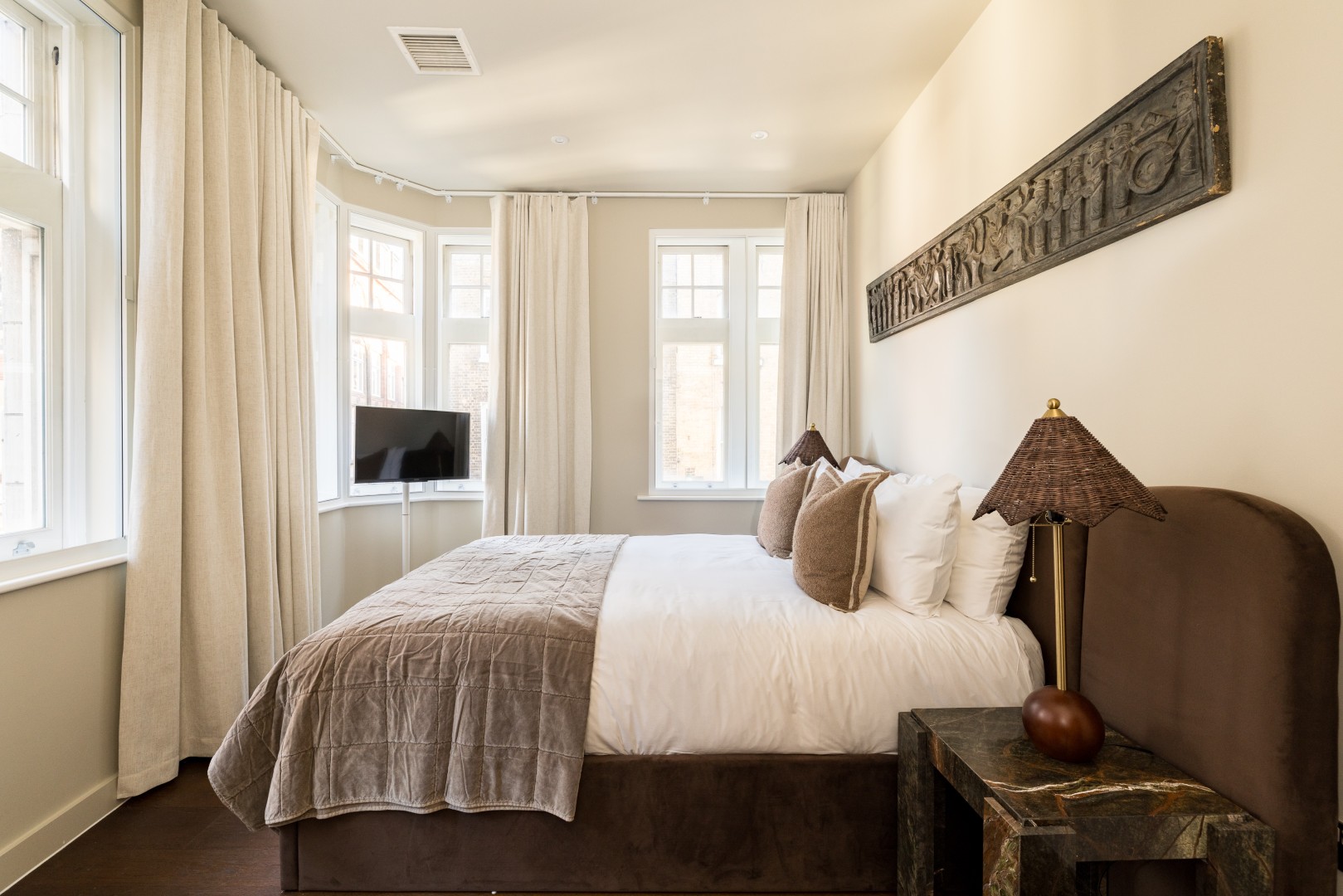 Beautifully designed 2-bedroom apartment on the first floor in the heart of Soho. Calm, stylish interiors with a statement chandelier and curated designer details throughout. TVs with Netflix in both bedrooms and the living room. Air conditioning for warm summer nights. Secondary glazing makes the bedrooms impressively quiet for a restful sleep, despite the central location. Perfect for holidays, short stays or mid-length visits, in the heart of London.