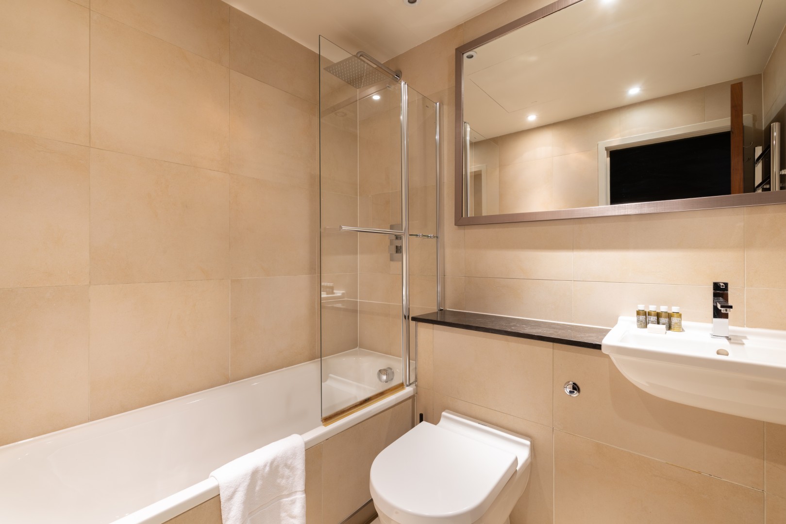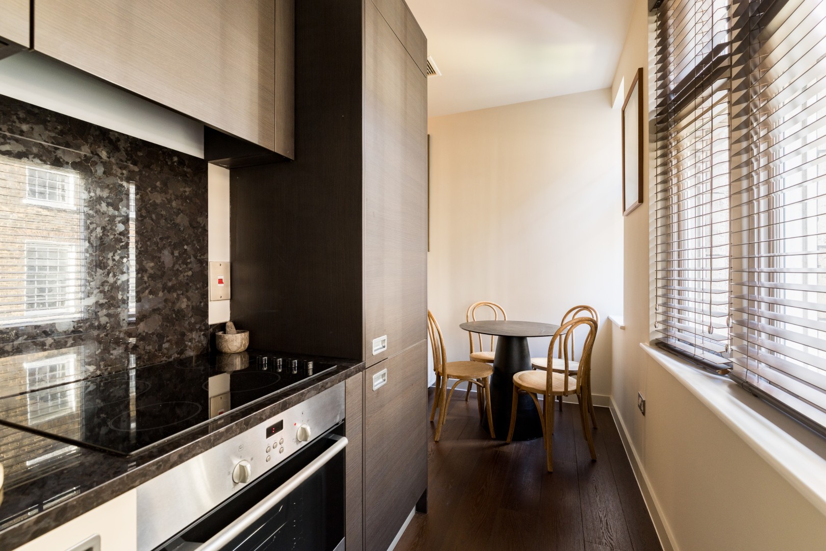 You enter into a welcoming hallway, with the first bedroom immediately to the right. The bathroom sits just beyond, before the apartment opens into a cosy, well-designed living room. Here you’ll find a comfortable seating area, a four-person dining table and a fully equipped kitchen neatly tucked to one side.